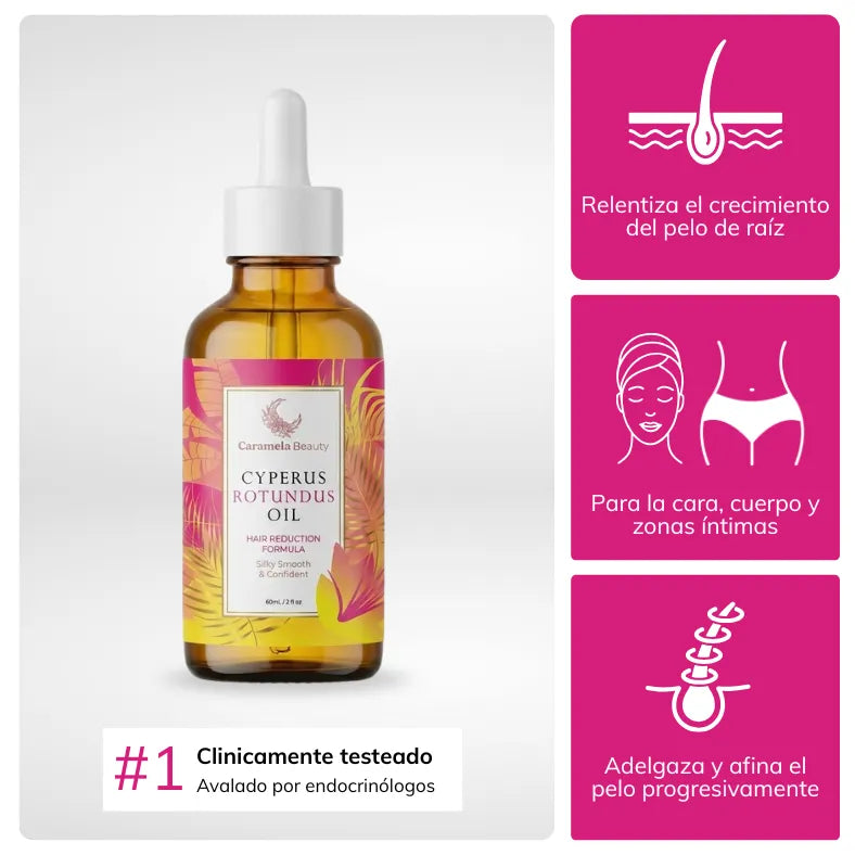 Nuestro sérum Cyperus Rotundus Skin Serum actúa en los folículos pilosos mediante bloqueos andrógenos localizados. Los compuestos activos inhiben la enzima 5α-reductasa y bloquean directamente los receptores de andrógenos a nivel folículo, reduciendo la producción de DHT y evitando la activación del crecimiento del vello.